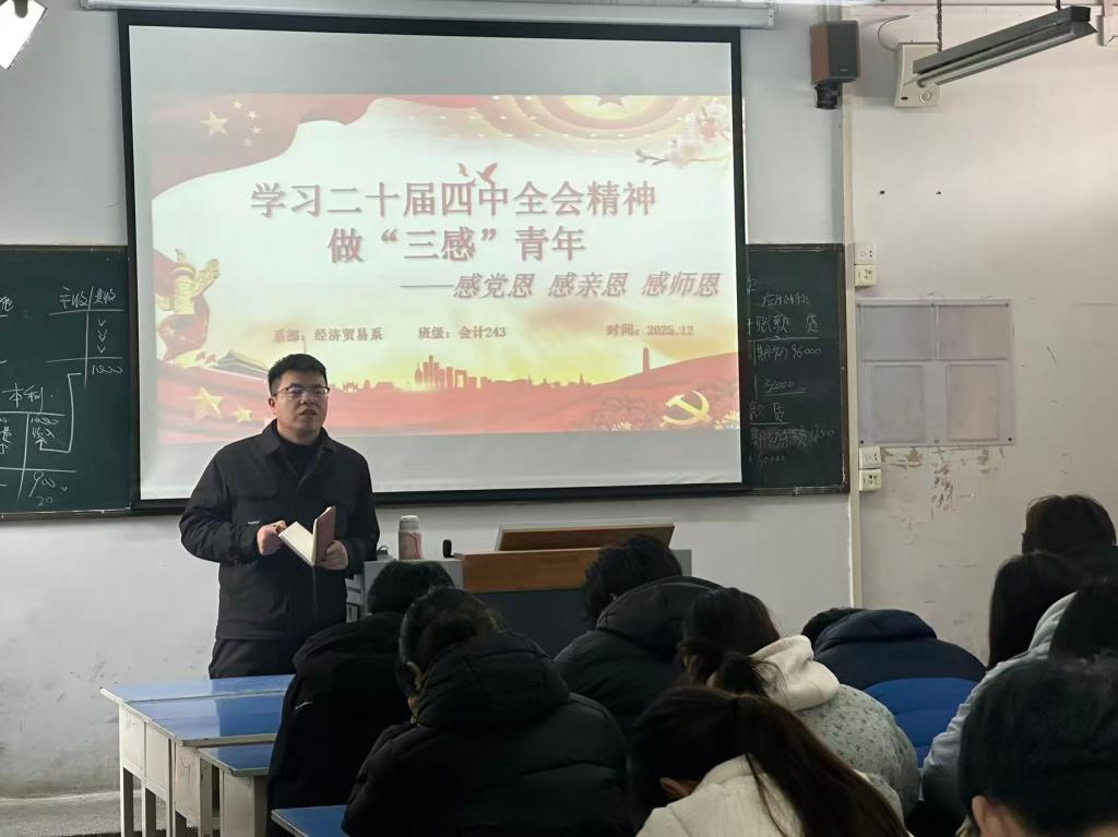 经济贸易系各班以“学习党的二十届四中全会精神,做‘三感’青年”为主题,教育引导学生践行“感党恩、感亲恩、感师恩”理念。“感党恩”环节,各班结合资助资金发放等让学生读懂资助政策背后的国家温度;“感亲恩”和“感师恩”环节,各班通过深夜关怀电话等唤醒学生的感恩之心。